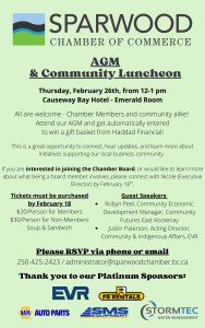 Our AGM luncheon is Thursday, February 26, from 12-1 p.m. All are welcome! Tickets must be purchased in advance- they are $20 for Chamber Members & $30 for non-Members. If you would like to join us, please call 250-425-2423 or email administrator@sparwoodchamber.bc.ca to be added to our attendance list & entered to win a gift basket from Haddad Financial Services. Limited seating available!
